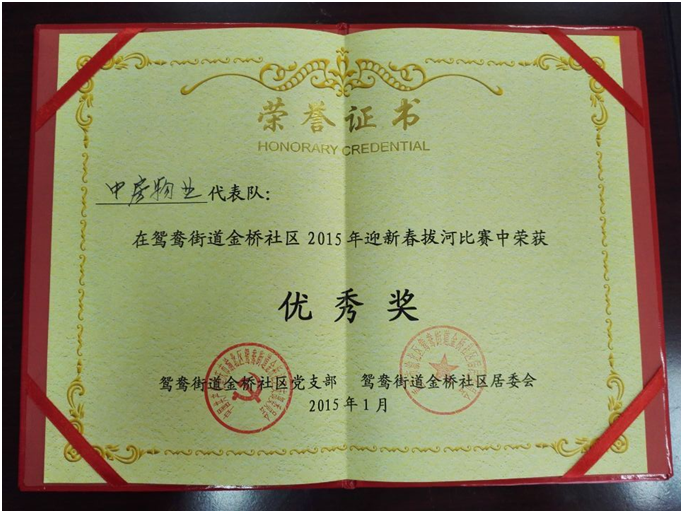 2015年公司尚嶺花園物管處參加北部新區(qū)鴛鴦街道金橋社區(qū)舉辦的“2015迎新春拔河比賽”,榮獲“優(yōu)秀獎(jiǎng)”。