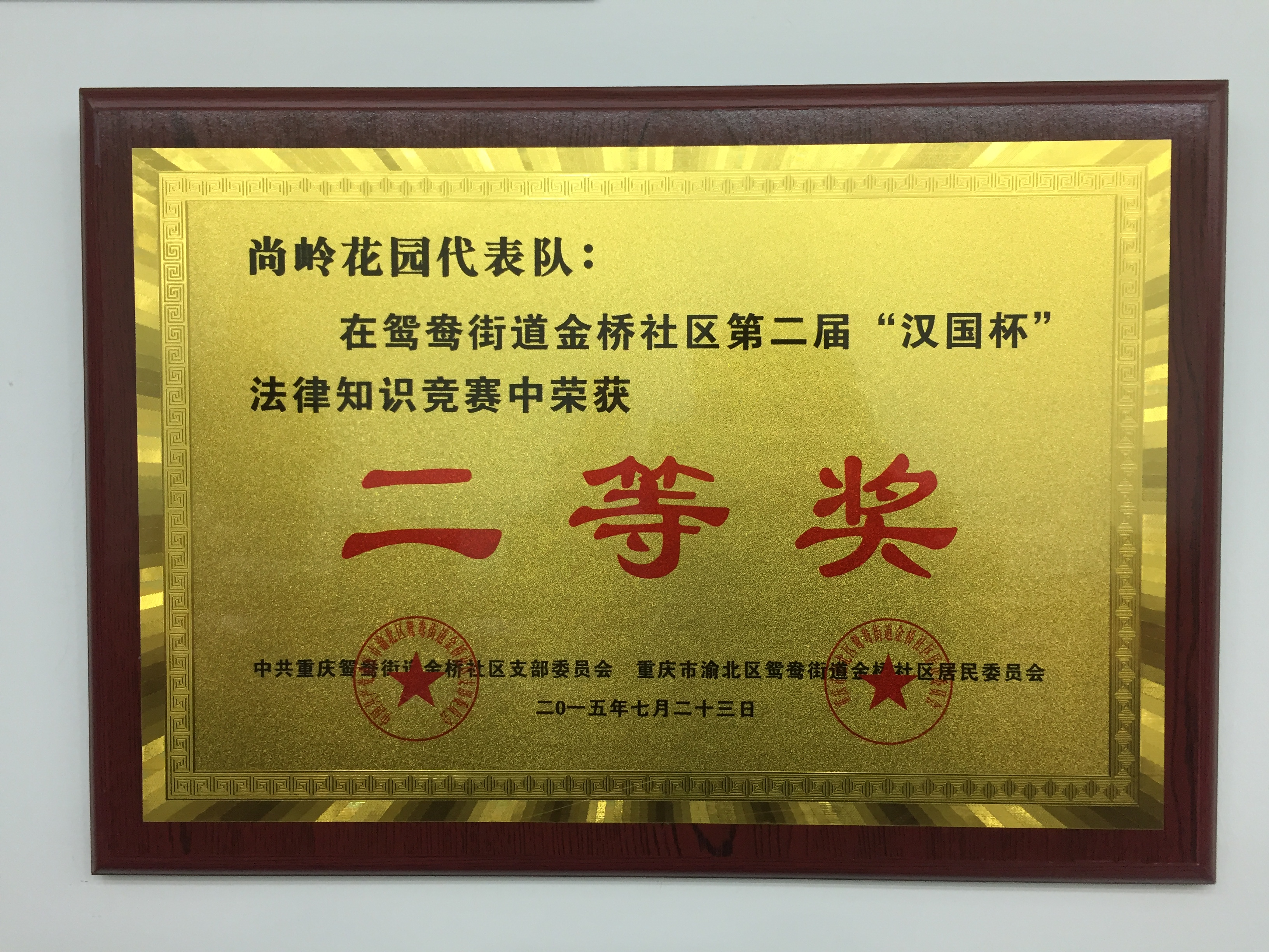 2015年公司尚嶺花園物管處參加北部新區(qū)鴛鴦街道金橋社區(qū)舉辦的“漢國杯”法律知識競賽,榮獲“二等獎(jiǎng)”。